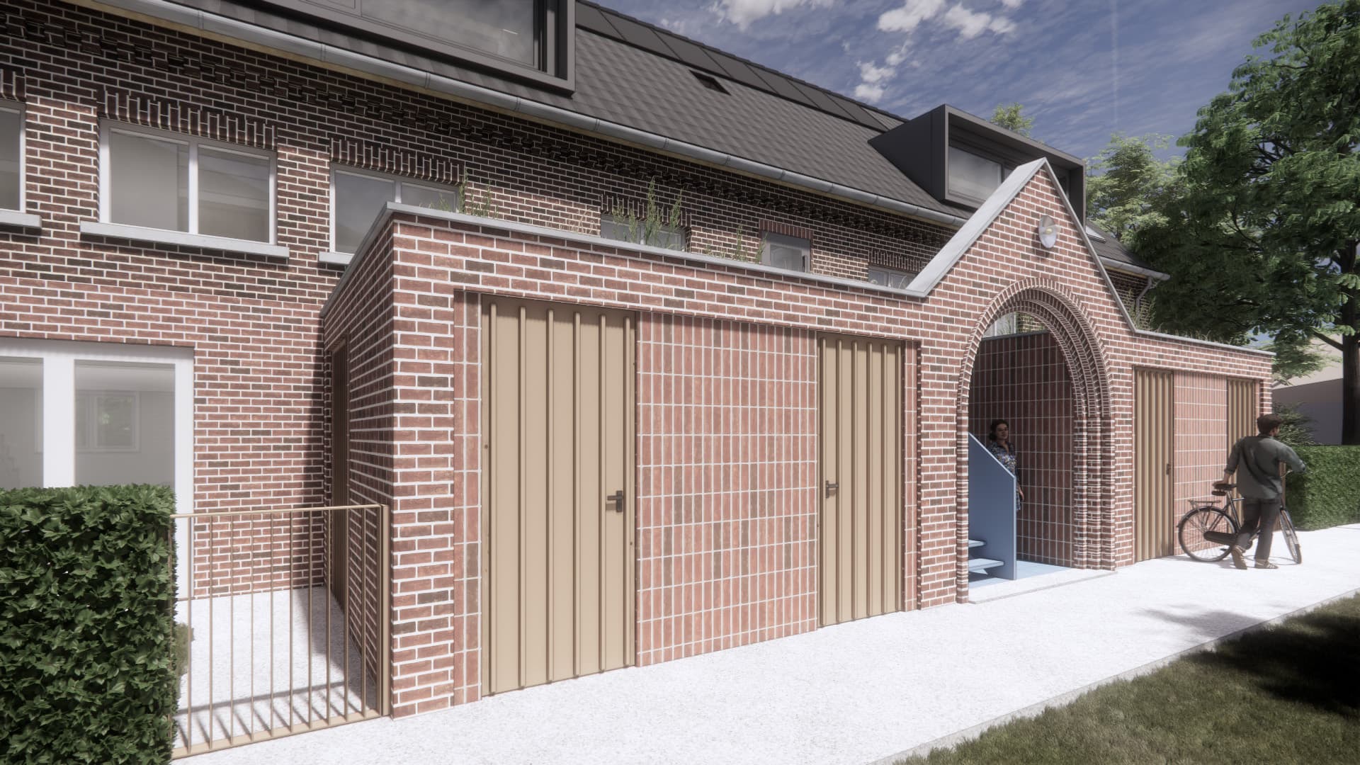 Naast het schoolgebouw verrijst het nieuwe 'Schoolhuis' - een eigentijdse interpretatie van de voormalige onderwijzerswoning. Deze 3-kapper biedt ruime eengezinswoningen met een tuin en past perfect bij het dorpse karakter van Meterik. Het ontwerp sluit aan bij de historische bebouwing rondom het schoolplein, met zorgvuldige detaillering in het metselwerk en een respectvolle maat en schaal.